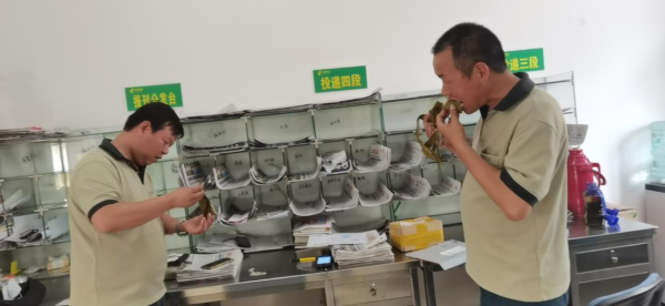 6月11日上午,由工會、綜合辦、營業(yè)局、寄遞事業(yè)部和縣分公司等部門組成的“送粽小分隊”統(tǒng)一去食堂領取煮好的粽子,“兵分六路”,送至各基層站點。截至6月11日中午,全區(qū)所有基層站點均收到“暖心粽”。從反饋的信息和圖片來看,一線工作人員很滿意此次的端午節(jié)“禮物”。