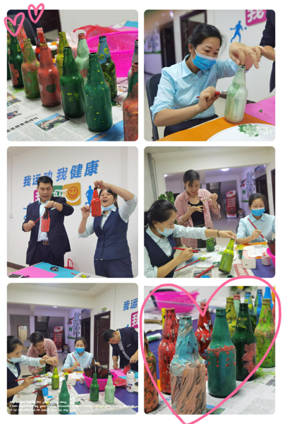 大家利用日常收集的廢棄玻璃瓶子,通過(guò)手上的畫(huà)筆一點(diǎn)一點(diǎn)在瓶子繪上不同的色彩,最終繪制成自己想要的模樣,繪制完后,看到自己完成的作品的時(shí)候,那種開(kāi)心和笑容是發(fā)自?xún)?nèi)心的成就感。大家笑著說(shuō):“生活可以多姿多彩,藝術(shù)也可以很簡(jiǎn)單,原來(lái)我也是個(gè)被耽誤的藝術(shù)家”。同時(shí)把繪制好的瓶子拿來(lái)裝飾職工之家,讓職工之家更具活力,更有魅力。