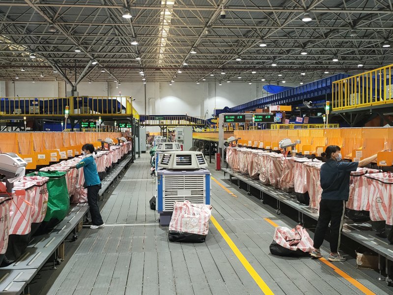 隨著高溫攀升,廣航中心各個(gè)生產(chǎn)車間也進(jìn)入“蒸烤”模式,個(gè)別工位由于離屋頂較近,最高溫達(dá)到50℃,廣航中心根據(jù)風(fēng)險(xiǎn)強(qiáng)度以及生產(chǎn)作業(yè)要求配備降溫設(shè)施,比如在部分離屋頂較近的工位配置六面空調(diào)扇、卸車崗位配備風(fēng)量強(qiáng)勁的筒扇、在同城分揀線放置工位風(fēng)扇等。有較大安全隱患且又因離吊頂太近無法安裝吊頂大風(fēng)扇的位置,廣航中心在多處調(diào)研后,安排裝置了立柱大風(fēng)扇,改善了原有設(shè)備占地大、風(fēng)向單一的缺陷。